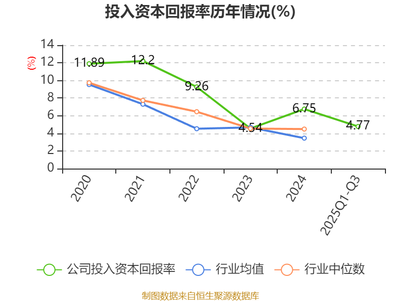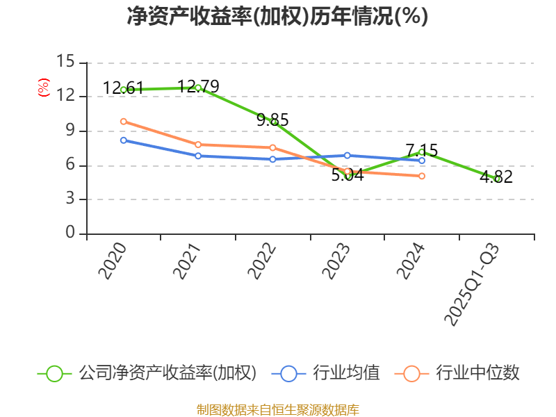盈利能力方面, 2025年前三季度公司加权平均净资产收益率为4.82%,同比下降0.77个百分点。公司2025年前三季度投入资本回报率为4.77%,较上年同期下降0.55个百分点。